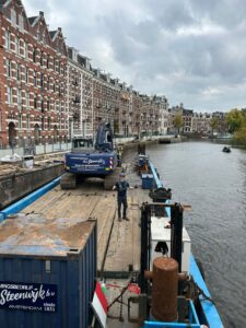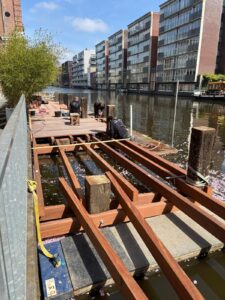 In opdracht van GF Deko zijn we in het centrum van Amsterdam bezig met het verlengen van de bestaande steiger bij Gassan. In totaal wordt