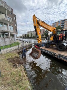 Bij OKU House in Amsterdam Nieuw-West zijn we momenteel bezig met het gedeeltelijk droogzetten van de watergang, zodat we de onder- en bovenwater beschoeiing netjes