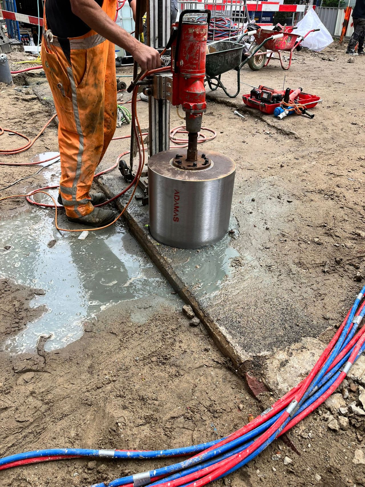 Voor het versterken van de landhoofden zullen we in een later stadium een bouwkuip ontgraven. Om ervoor te zorgen dat er veilig in deze bouwkuip gewerkt kan worden, is B&P Bodeminjectie momenteel bezig met een waterglas injectie onder de rijbaan. Tegelijkertijd boort De Jong Betonboringenย gaten door de brug en de brugvleugels, waar we na de bouwvak schroefinjectiepalen van ruim 20 meter in gaan schroeven.