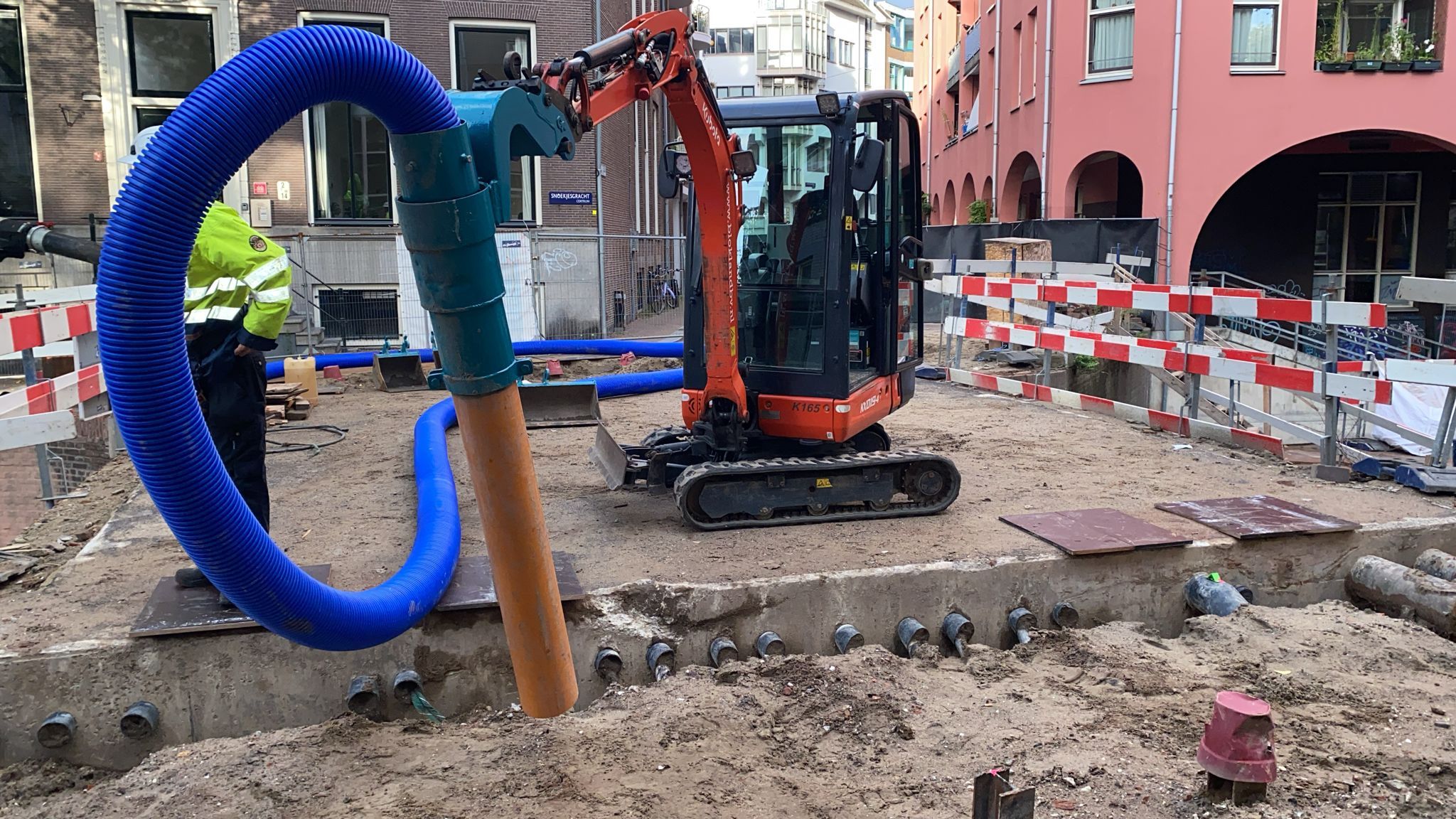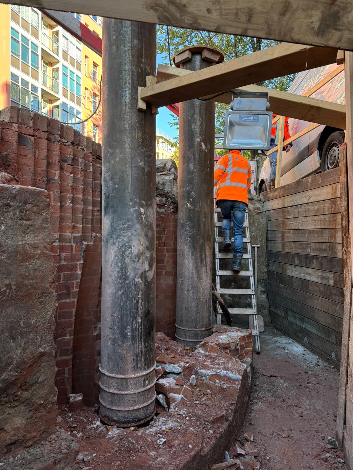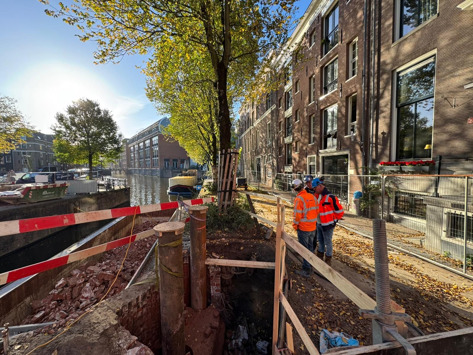 Op de Snoekjesbrug zijn we volop bezig met onze werkzaamheden. Achter de landhoofden is de grond weggezogen ten behoeve van de bouwkuip, en we hebben de berlinerwand gemaakt met hergebruikte damwandplanken. Daarna zijn we begonnen met het slopen van het metselwerk en het afsnijden van de palen die we eerder door de landhoofden heen hebben geschroefd.