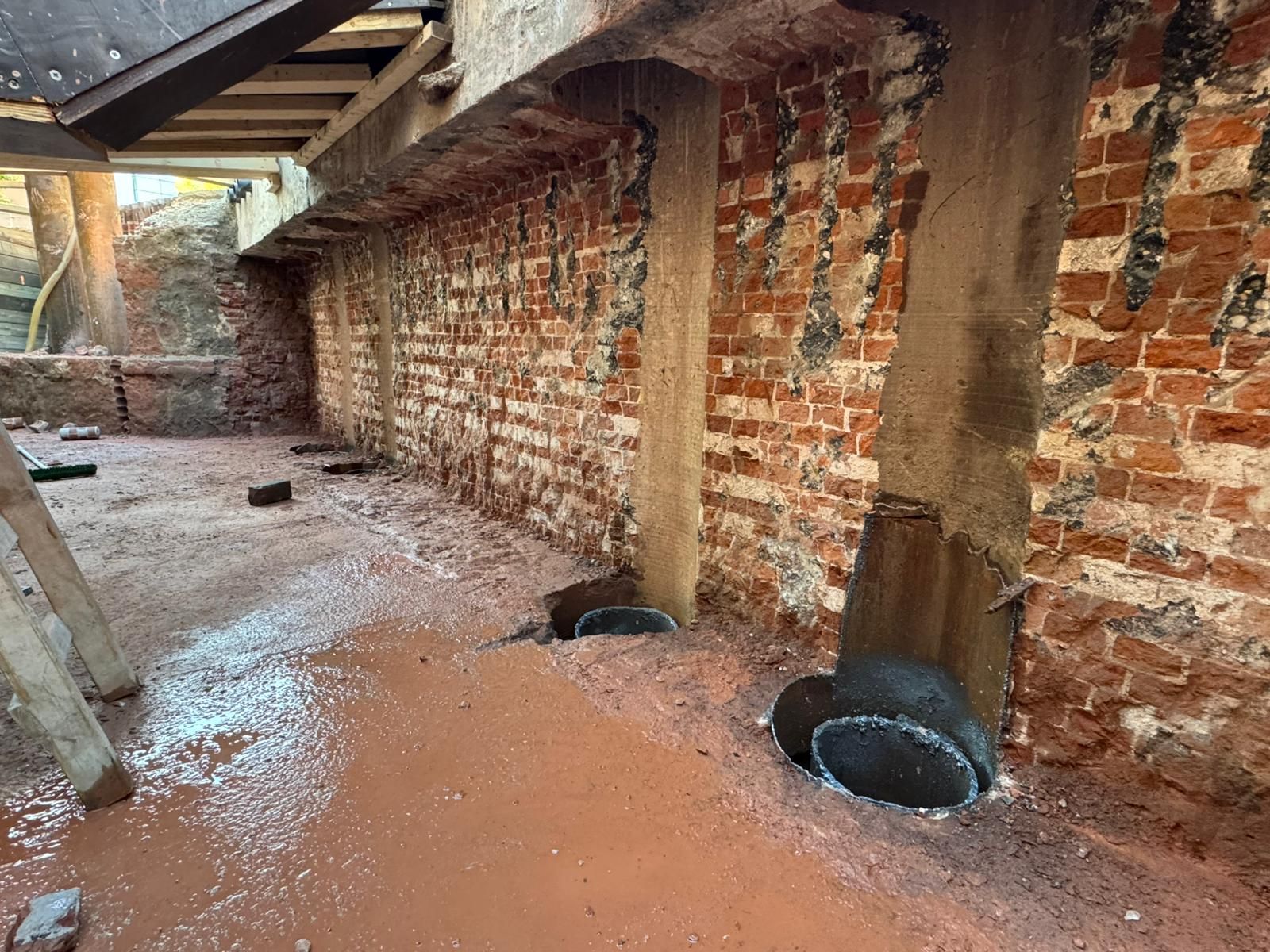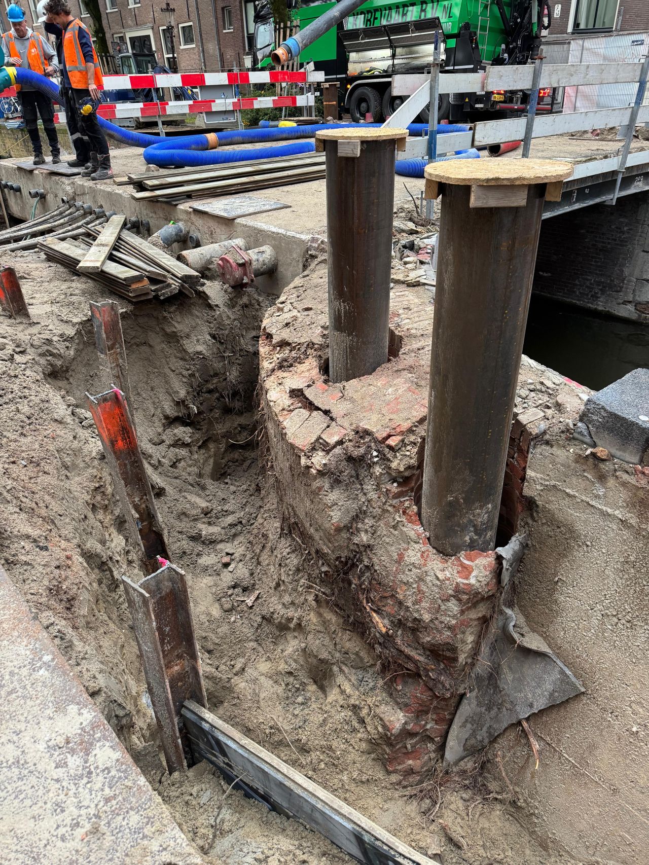 De komende tijd brengen we schoorpalen aan in de brugvleugels en verbinden we deze met de al geplaatste te lood palen. Vervolgens maken we onder de brug een betonnen onderslagbalk waarop we vijzels plaatsen die de zullen palen activeren. Dit doen we zodat de fundering straks weer stevig is en de brug er weer jaren tegenaan kan!