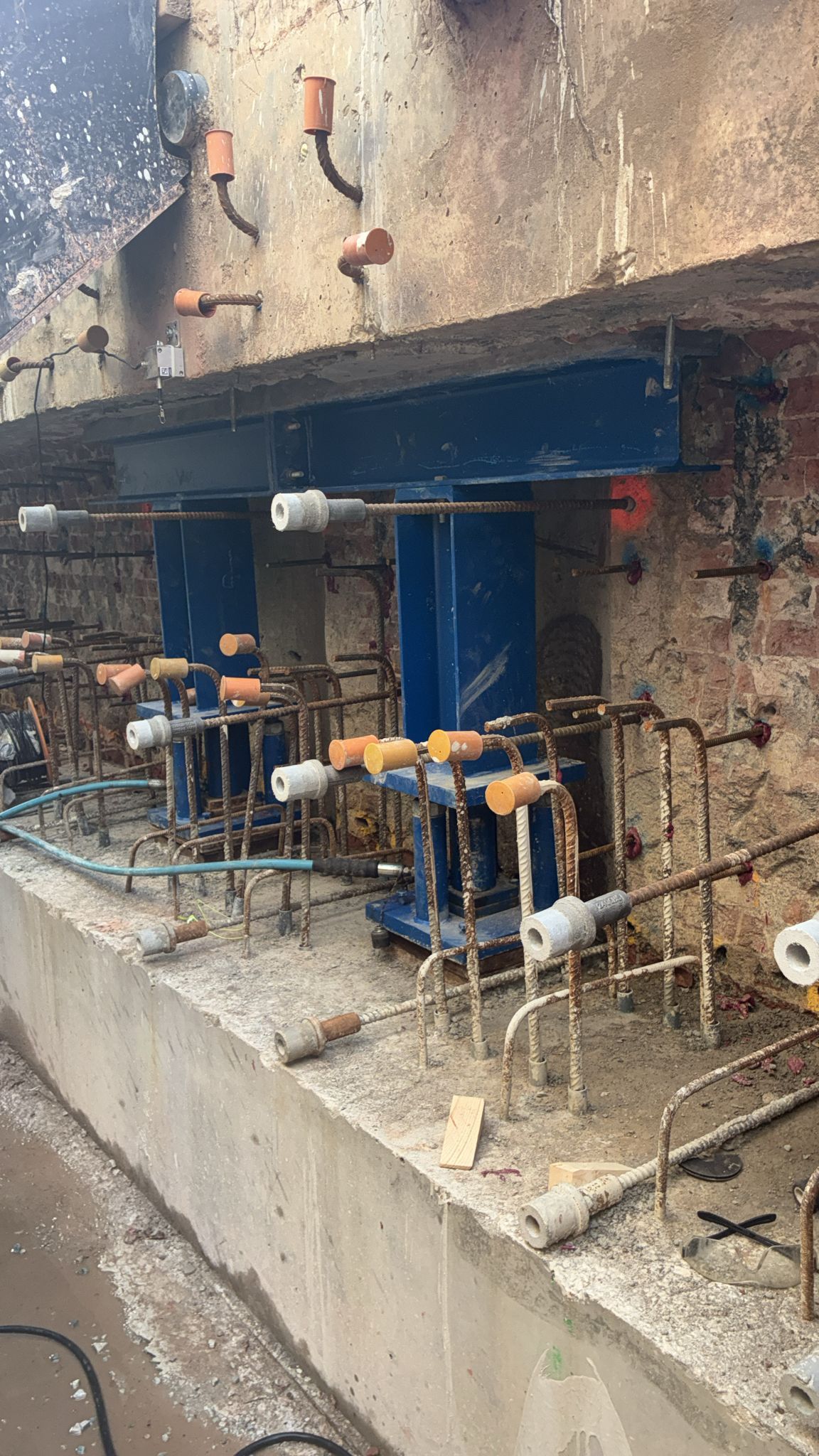 We hebben gevijzeld tussen de landhoofden van de brug en de schroefinjectiepalen om de palen te activeren, in samenwerking met Civiele Technieke de Boer. De holle ruimte (tussen de nok en de werkvloer) was toen al gevlochten door Balvert, dus dat was flink pielen tussen de wapening door. Het vijzelen hebben we in drie fases gedaan, waarbij we steeds extra ballast op de brug hebben bijgeplaatst.