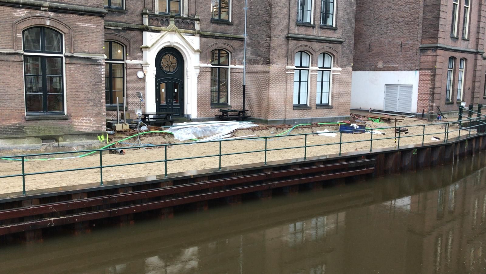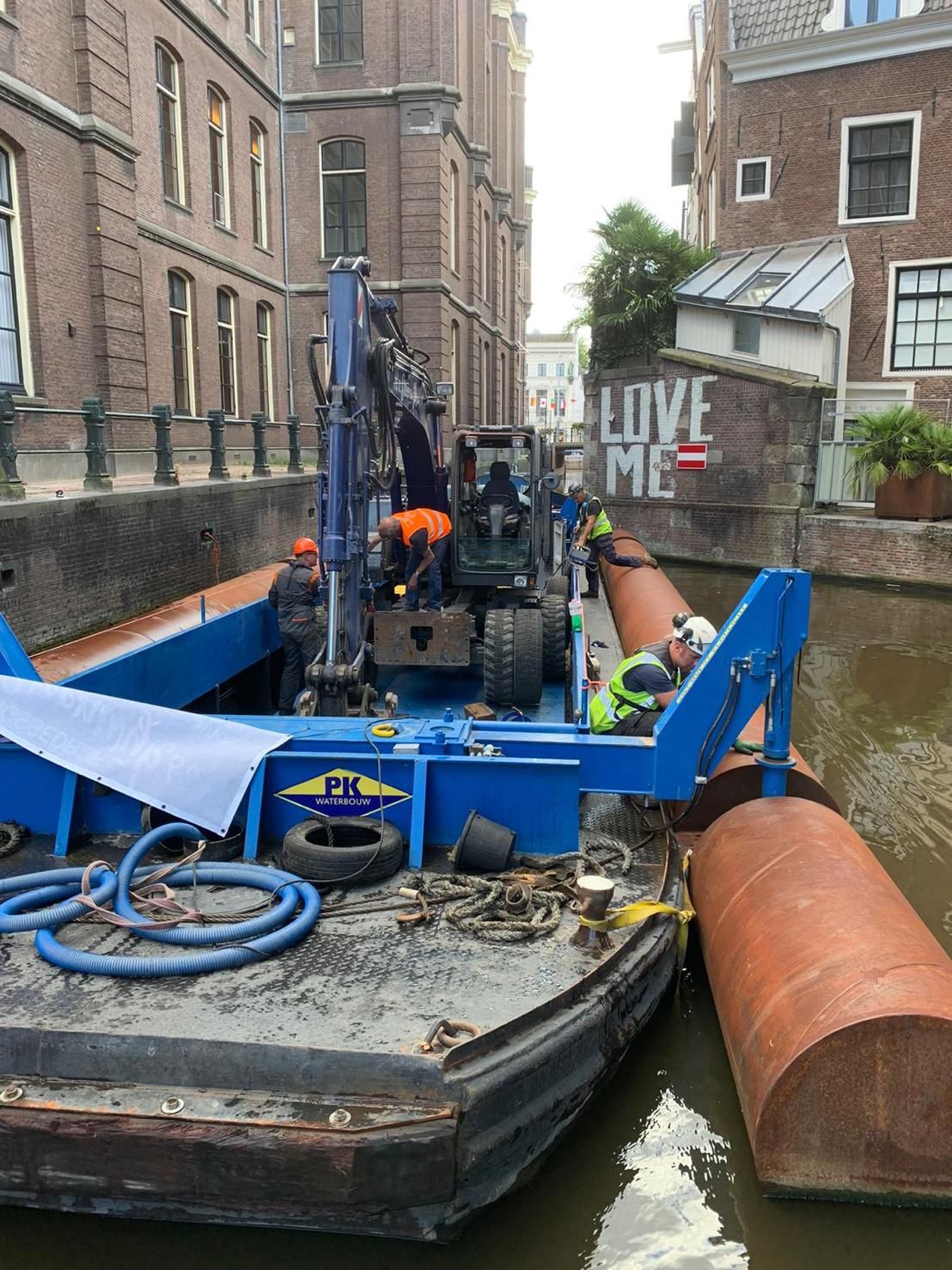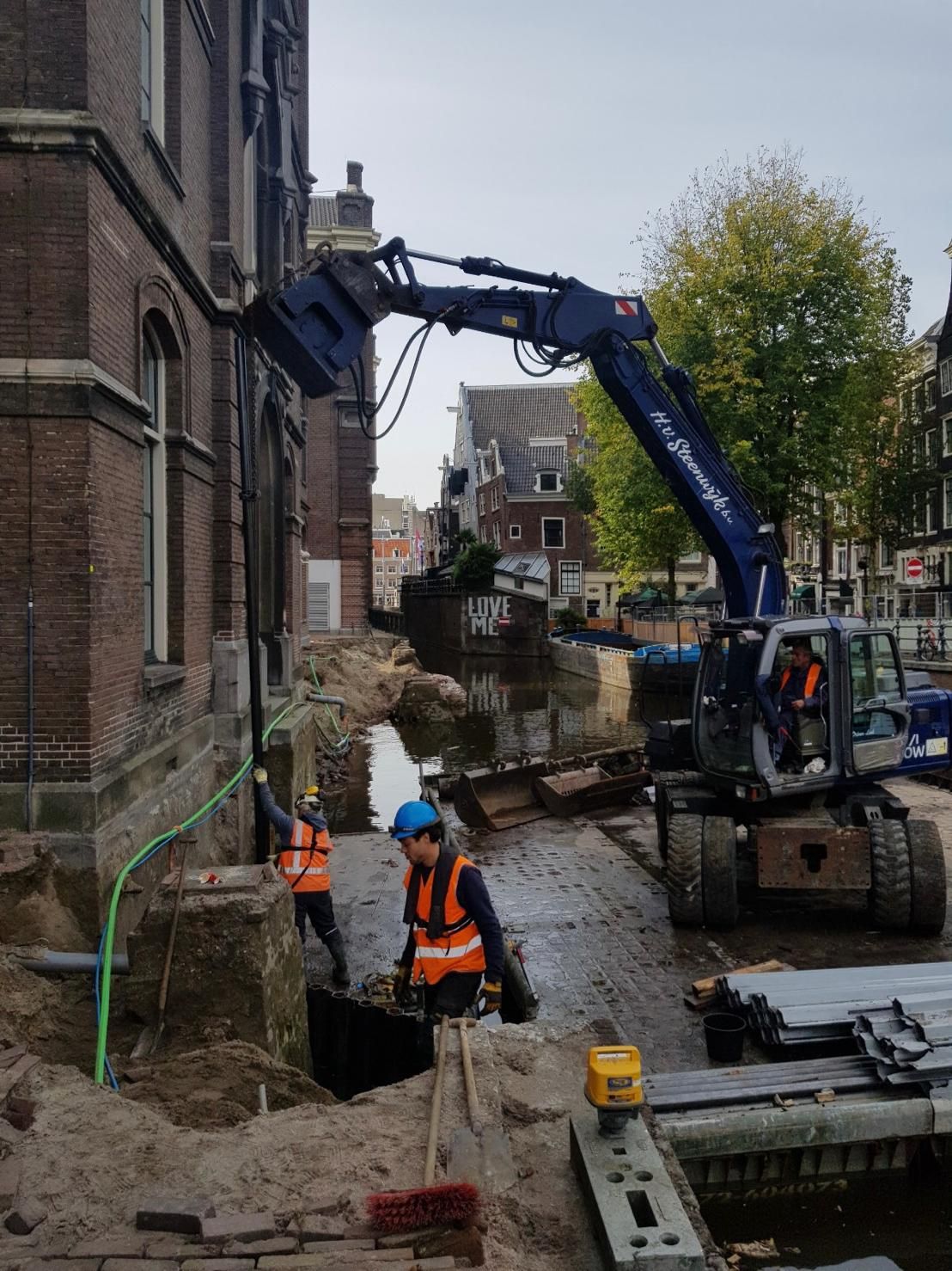 Diezelfde middag hebben we alles op alles gezet om het gebied af te zetten met hekken en werden de vaarroutes afgesloten. De volgende ochtend werd onze mobiele kraan via het water en onder kleine bruggetjes door aangevoerd. Daarvoor moesten zelfs de banden van de kraan worden verwijderd, om zo in een verdiepte bak overal onderdoor te passen. De hele nacht werd doorgewerkt om de situatie zo snel mogelijk veilig te stellen.